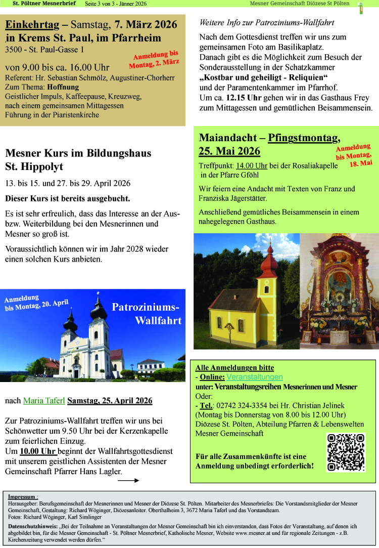 Samstag, 7. März 2026 - Einkehrtag in Krems St. Paul