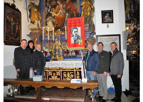 Der Diözesanleiter der St. Pöltner Mesner Gemeinschaft, Richard Wöginger hat aus seiner Diözese eine Fahne mit dem Bild des Sel. Franz Jägerstätter mitgenommen. Zur besonderen Verehrung des Seligen wird diese Fahne jedes Jahr bei der diözesanen Wallfahrt und einer Maiandacht mitgetragen.